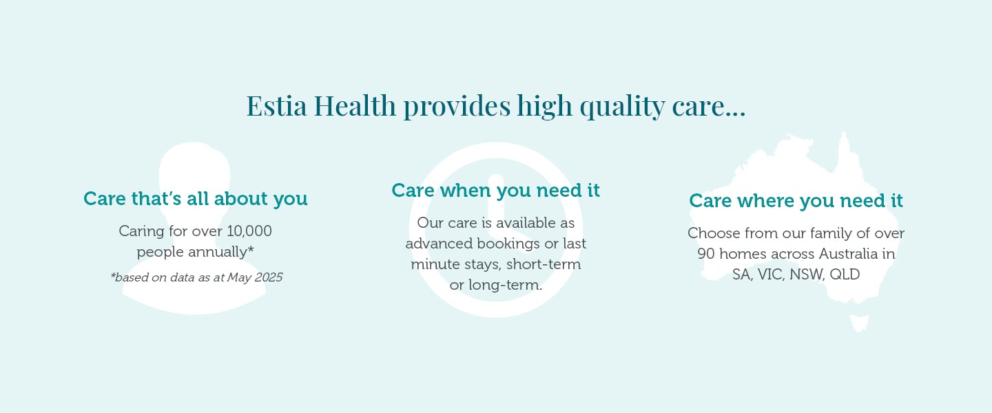 Thank you to our residents and employees that feature on our website. Estia Health is not affiliated nor associated in any way with the Estia Foundation of Australia, a registered charity and NDIS Disability Services Provider.